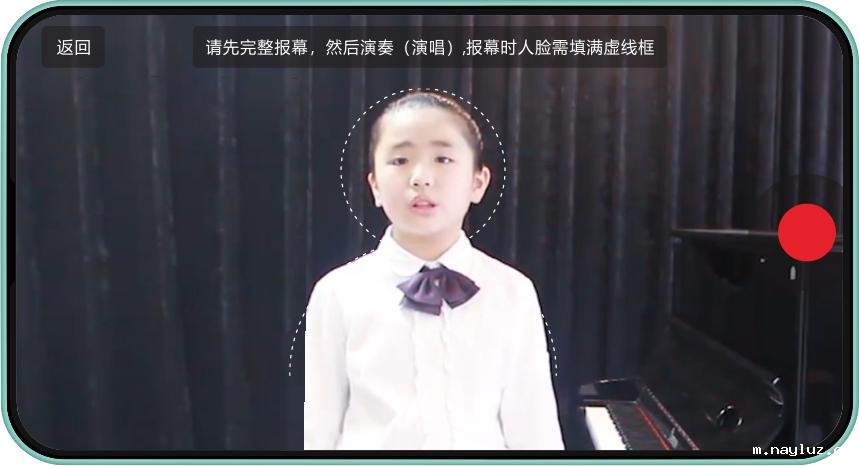 5、报幕要求:考生在开始录制视频前,必须正面朝摄像手机或平板智能终端报幕,需要将人脸完整填充拍摄界面的人形框,以便实现电脑人脸识别,清晰报出本人姓名、专业、级别后,开始录制。
