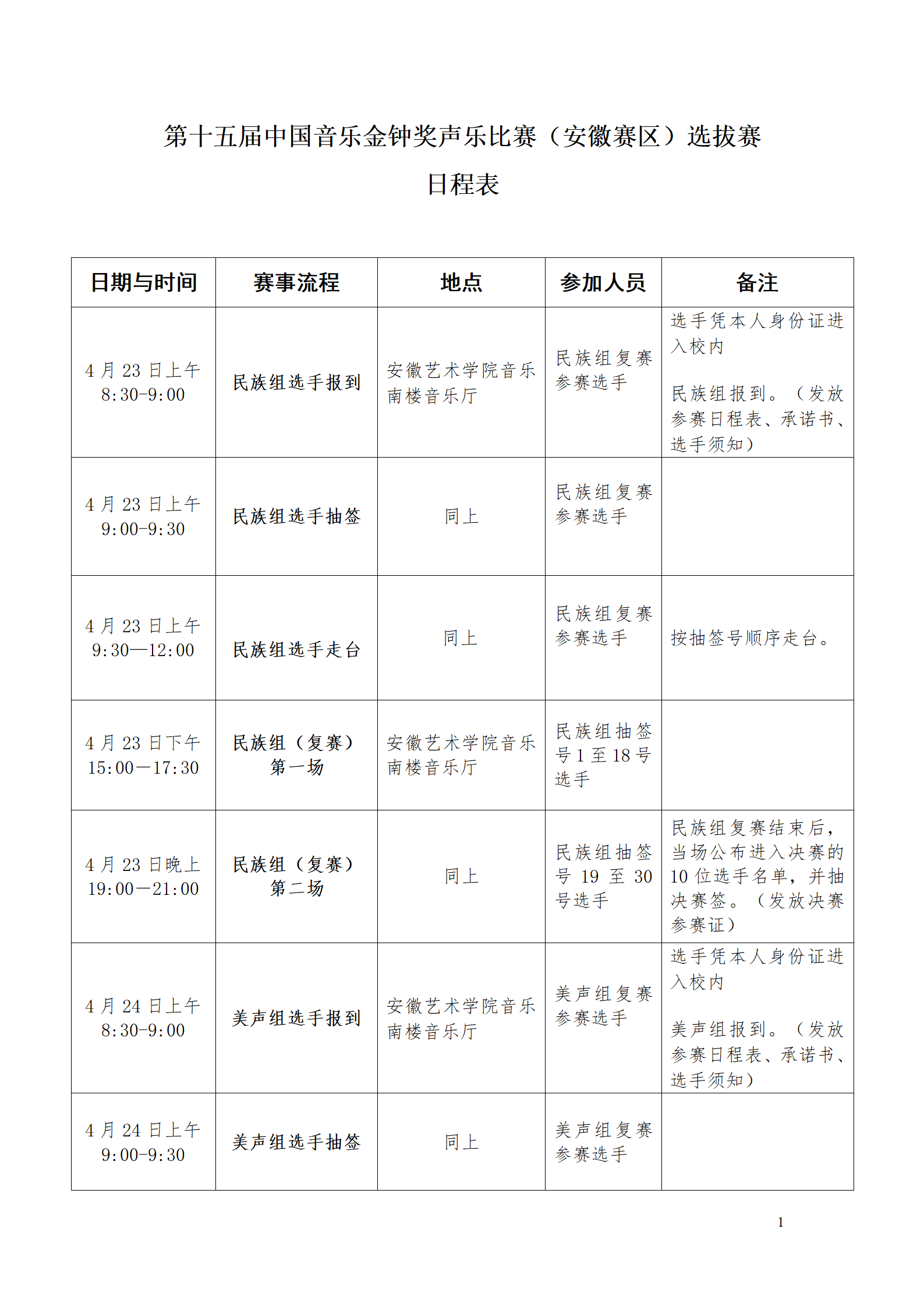关于第十五届中国音乐金钟奖声乐(美声、民族)安徽选拔赛复赛、决赛的通知